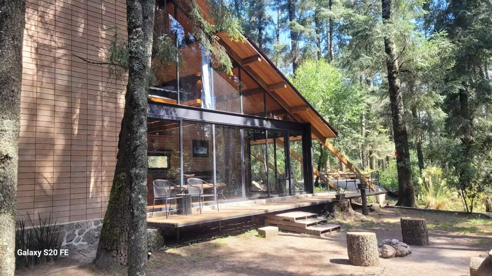 Una cabaña cálida de madera, con techo metálico y una terraza amplia elevada entre pinos, diseñada para despertar con luz natural y dormir con silencio de bosque. El deck tipo mirador invita a desayunar al aire libre, leer, tomar café o ver las estrellas, mientras la vegetación alrededor crea privacidad y una sensación auténtica de refugio. Es el tipo de hospedaje ideal para una escapada romántica o de descanso: simple, acogedor y totalmente conectado con la naturaleza.